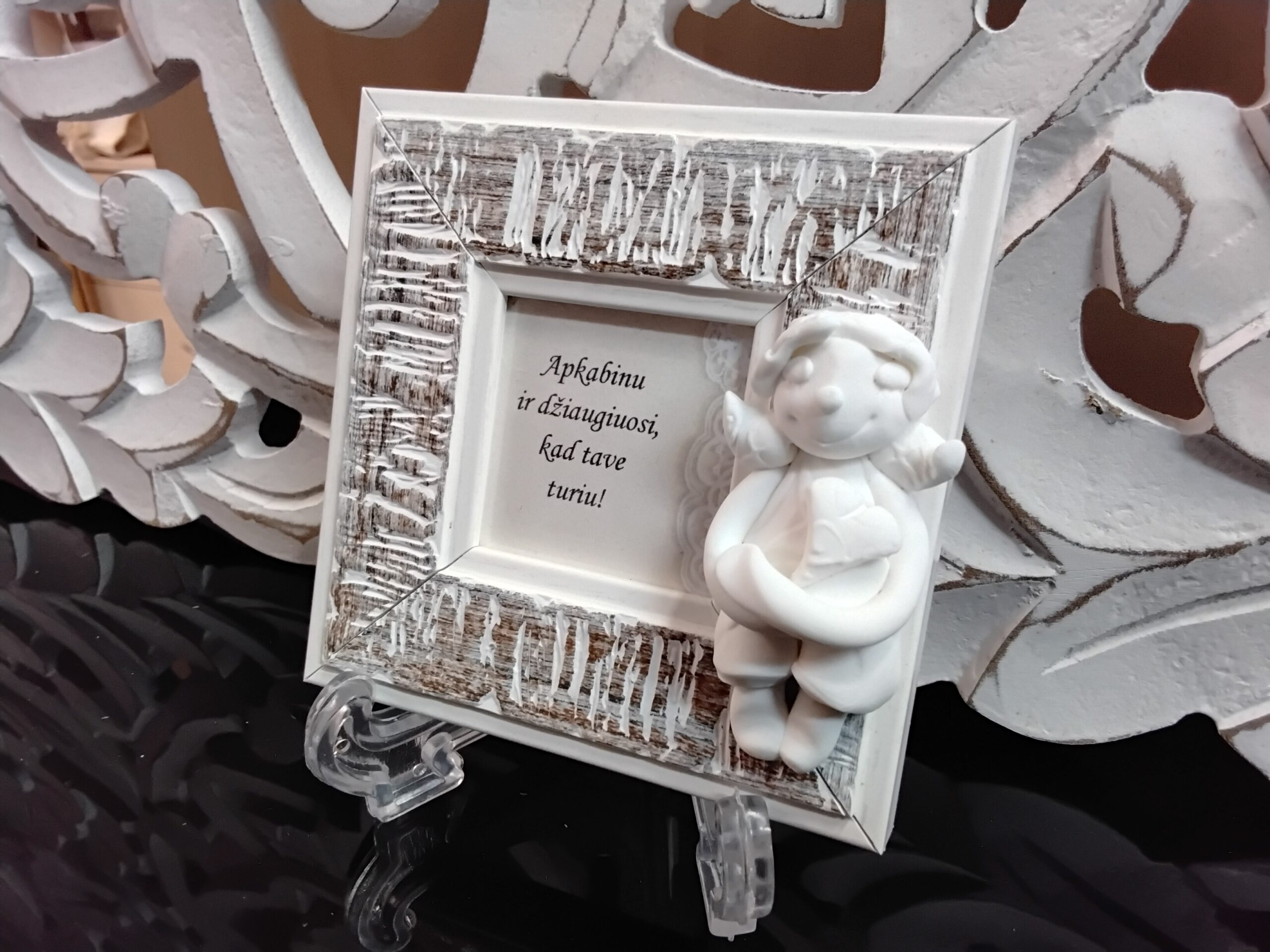Autorinis keramikos darbas su užrašu.