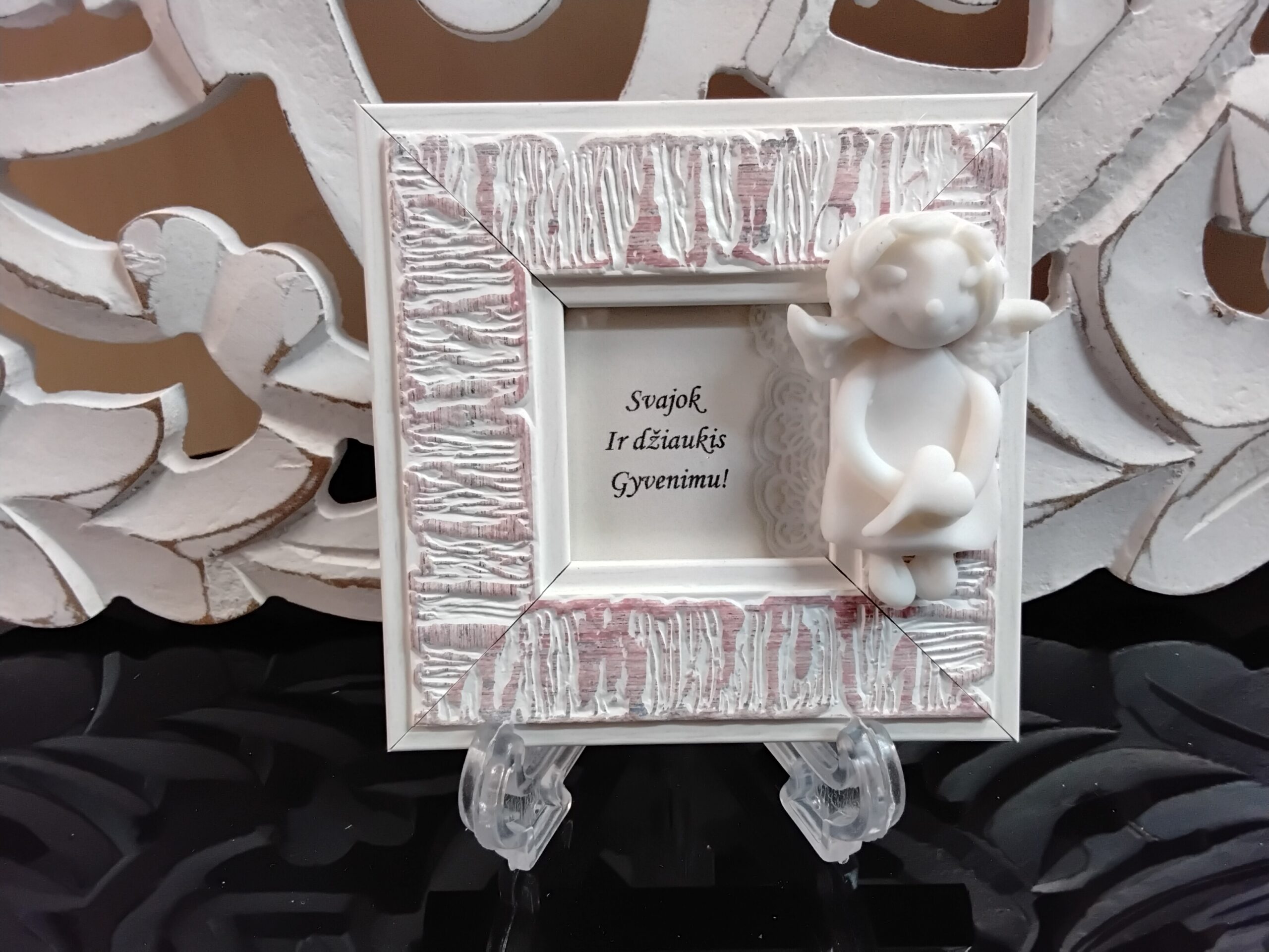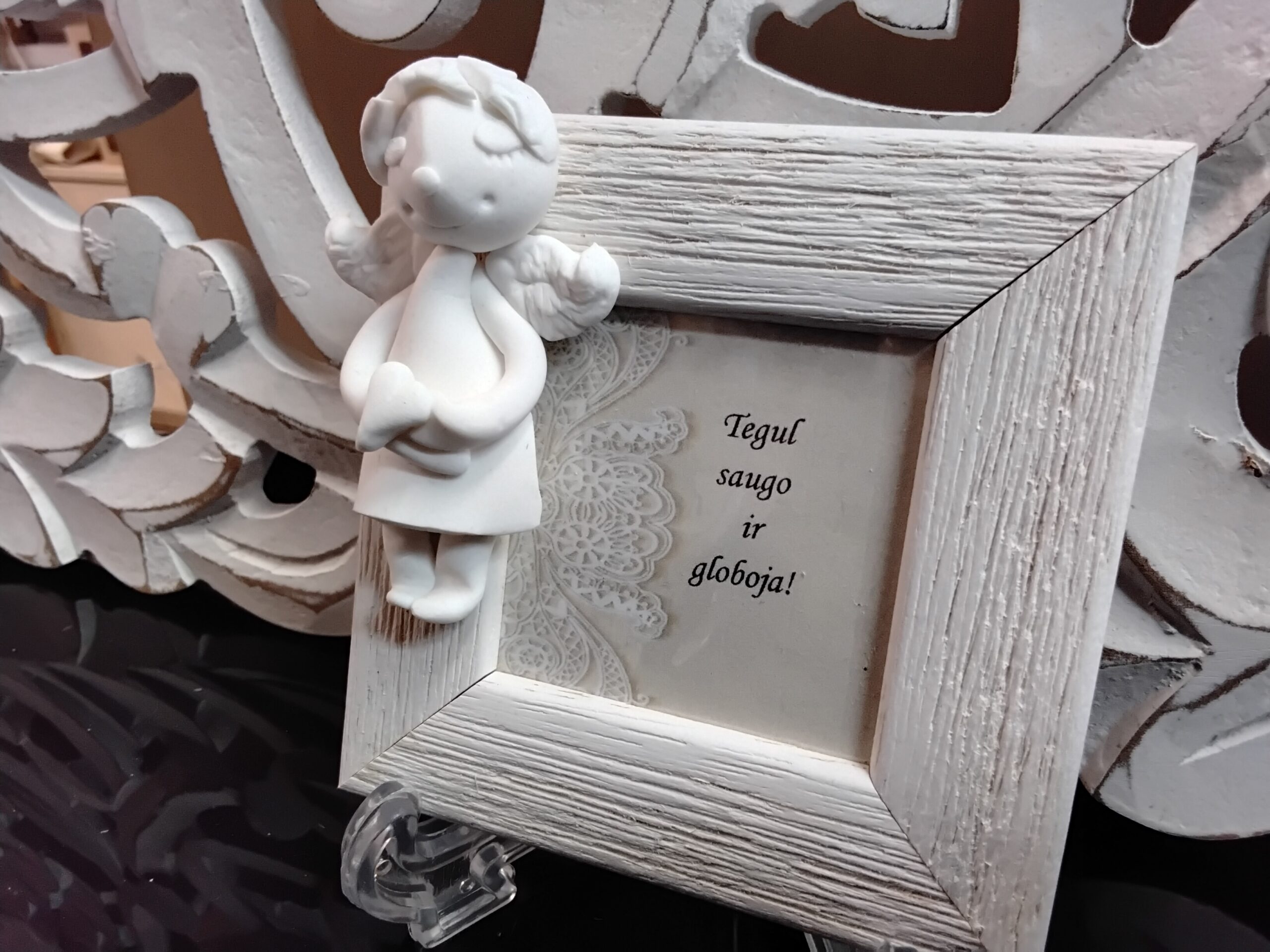 Autorinis keramikos darbas su užrašu.
